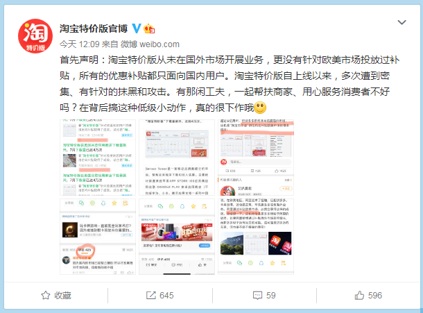 回应说:淘宝特价版从未在国外市场开展业务,更没有针对欧美市场投放过补贴,所有的优惠补贴都只面向国内用户。