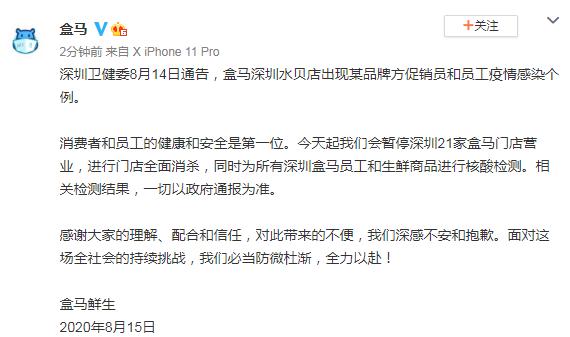 炣燃科技8月15日讯(宏斌)深圳,平静被打破。今天,盒马鲜生发布声明,由于深圳的一家门店出现员工感染病例,该公司不得不暂停深圳21家盒马门店营业,进行门店全面消杀。