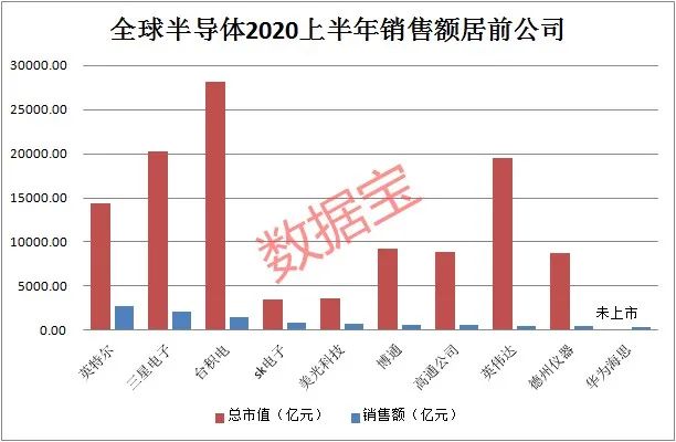 半导体市场咨询机构IC Insights近日公布了今年上半年全球十大半导体公司的销售额排名。十大公司中有6家总部位于美国,2家位于韩国,1家位于中国台湾,华为海思继第一季度首次进入前十外,半年度排名亦为首次进入前十。