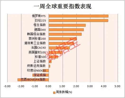 近一周全球重要股市指数涨跌不一,受疫苗进展顺利等利好消息刺激,多个指数走高,俄罗斯RTS指数和日经225指数涨幅最大,周累计均涨4.3%,日经225指数涨至近6个月高点。巴西IBOVESPA指数跌幅最大,周累计下跌2.25%。