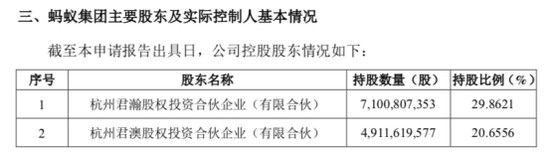 备案文件显示,蚂蚁持股5%以上的股东,分别为杭州君瀚股权投资合伙企业(持股29.86%,简称君瀚)、杭州君澳股权投资合伙企业(持股20.66%,简称君澳)以及阿里巴巴集团。也就是说,两家员工持股平台合计持股超过50.52%。