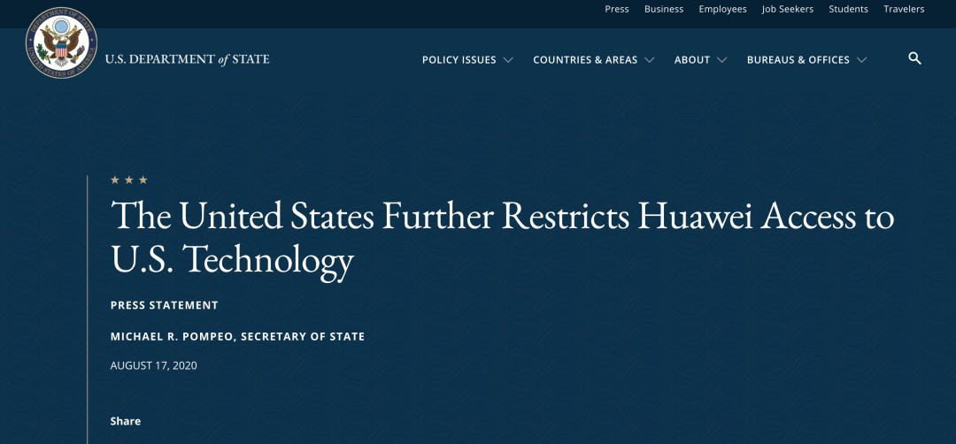 在美国国务院官网发布的声明中,蓬佩奥称,“国务院强烈支持商务部今天扩大其外国直接产品规则,这将阻止华为通过‘替代芯片生产’与‘提供用从美国获得的工具生产的现成芯片’来规避美国法律。”