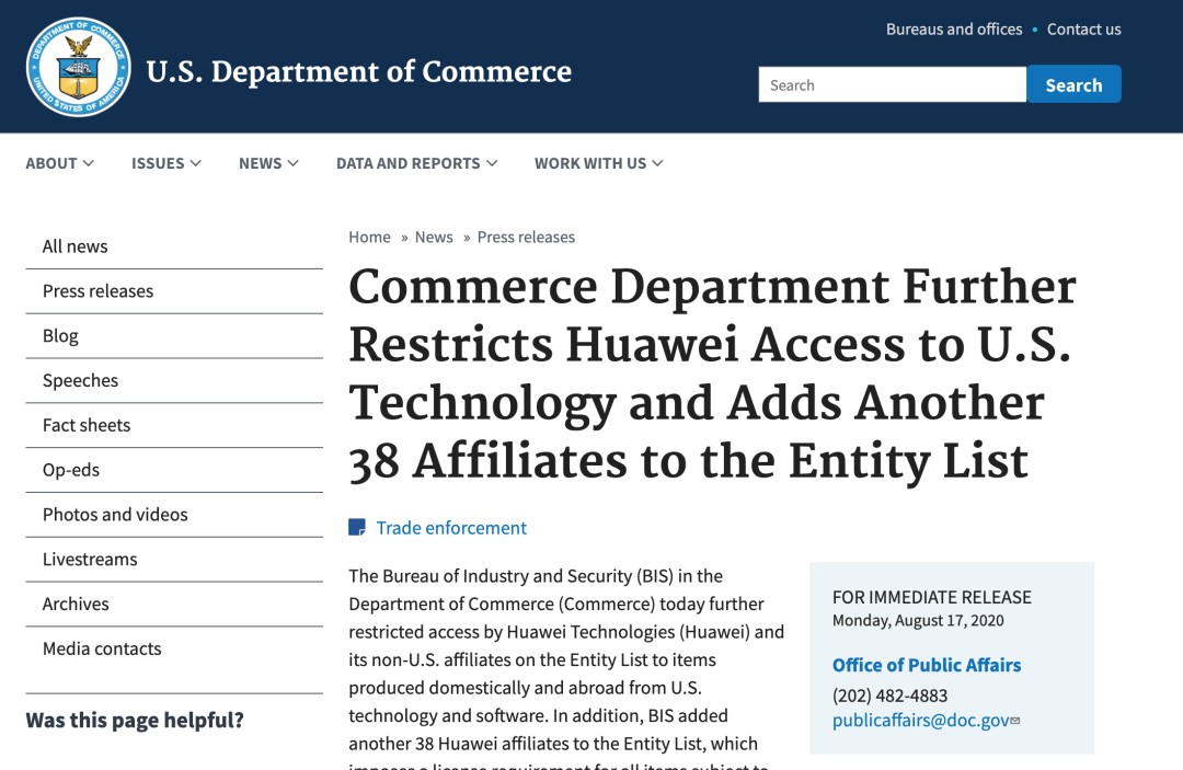 美国商务部对华为限制升级!