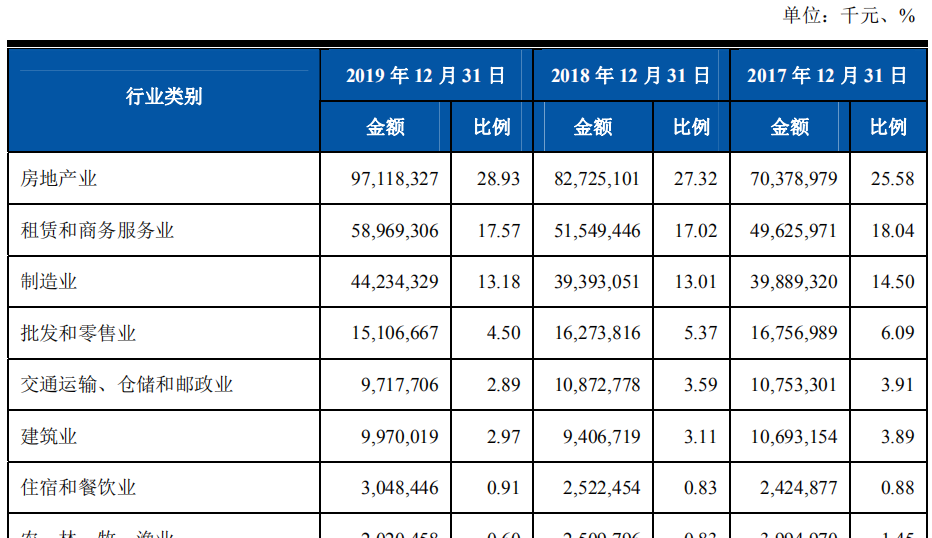 招股书显示,2017年-2019年各年末,上海农商行向房地产业客户发放的贷款和垫款分别占企业贷款和垫款总额的25.58%、27.32%和28.93%。