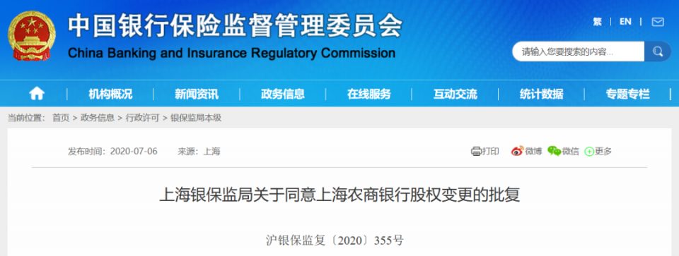 今年7月,上海银保监会终于作出关于同意上海农商行股权变更的批复。批复显示,上海久事集团受让上海国际集团及上海国际集团资管合计持有的7.34亿股股份,受让后,上海久事集团占上海农商行总股份的8.45%。