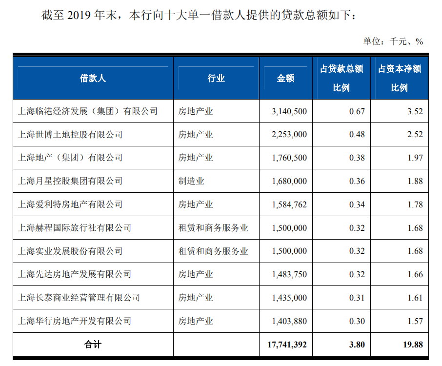 这一指标已经远超过行业平均值。据《每日财报》报道,2019年36家A股上市银行的房地产贷款、垫资占比平均值为6.98%,其中最高的现为上海银行15.88%。