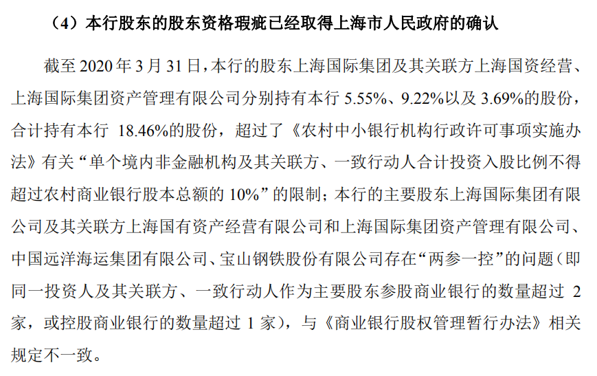 这一次,上海农商行在股东资格情况中诚实的表示,该行股东资格存在瑕疵。有意思的是,该行招股书又称,股东资格瑕疵已取得上海市人民政府的确认。