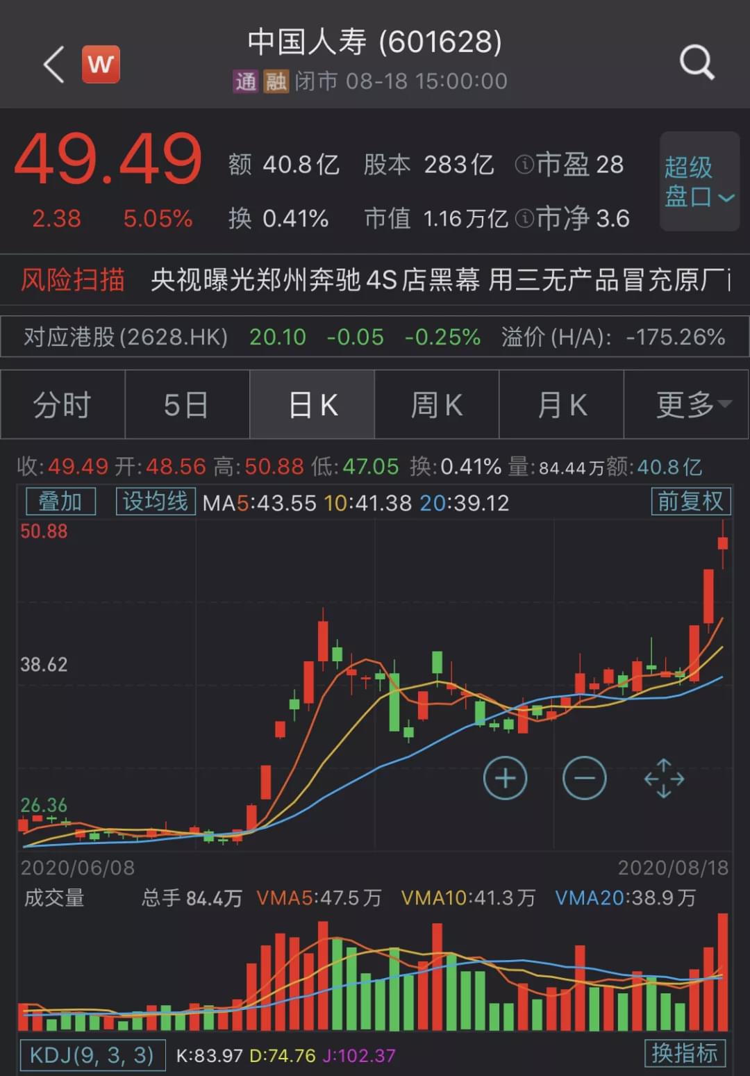 8月18日晚,中国人寿发布《股票交易异常波动公告》。该公司A股股票于8月14日、8月17日、8月18日连续三个交易日收盘价格涨幅偏离值累计超过20%,构成上交所规定的股票交易异常波动情况。
