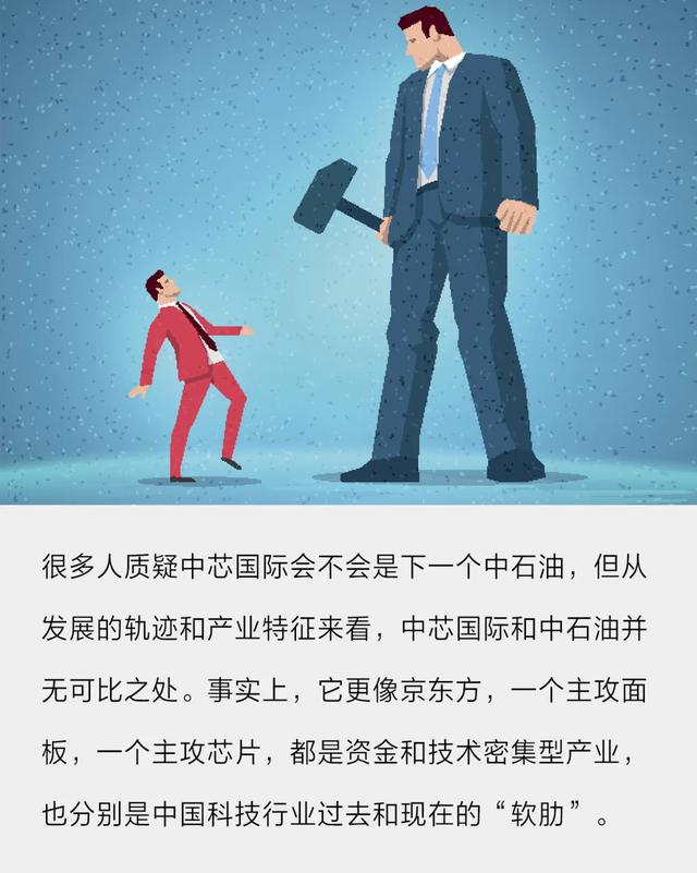 但从发展的轨迹和产业特征来看,中芯国际和中石油并无可比之处。事实上,它更像京东方,一个主攻面板,一个主攻芯片,都是资金和技术密集型产业,也分别是中国科技行业过去和现在的“软肋”。