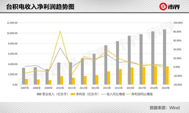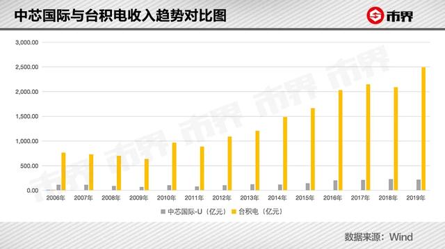 2006年时,台积电营收765.93亿元,是中芯国际的6.7倍。到2019年,台积电营业收入约为2491亿元,是中芯国际的11.3倍。13年时间,技术的落后成倍地反映在收入规模上。