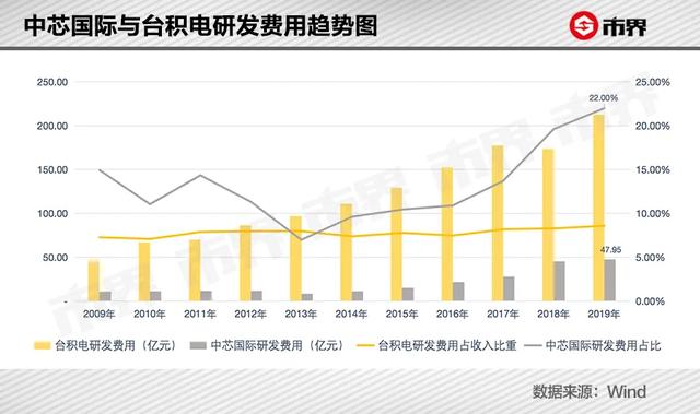 也是从那时开始,中芯国际的研发投入开始大幅度提高,从2016年的22亿元,增至2019年的47.44亿元,占收入比重从10.92%提高到22.0%。虽然无法弥补绝对值上的鸿沟,但至少已经显示了追赶的决心。