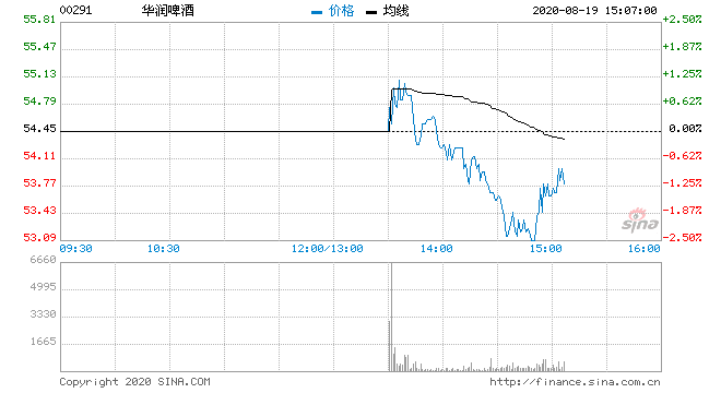 新浪港股讯,华润啤酒(00291)中期多赚11%,惟对股价的刺激作用短暂,平开后曾冲高至55.5元,升幅近2%,目前已倒跌2.3%,报53.2元,日中低位为53.1元;成交约273万股,涉资1.49亿元。