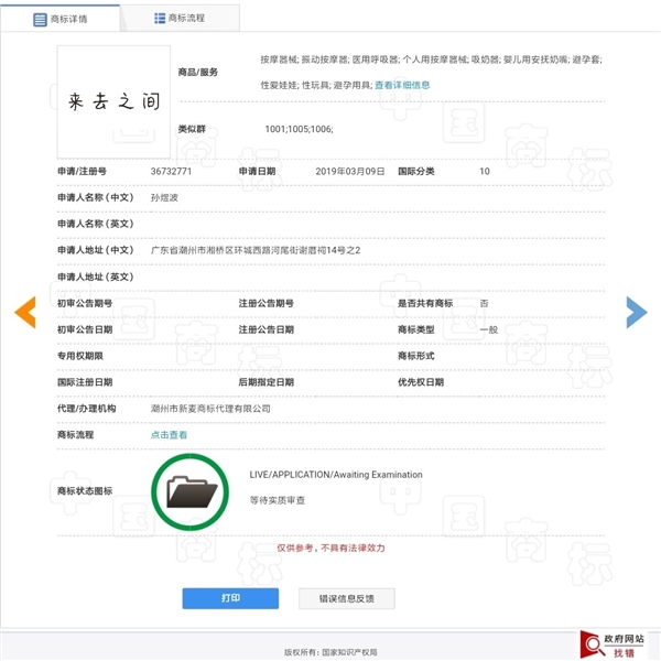 其中有意思的是,于2019年3月份申请“来去之间”商标的孙煜波(个人)的商标用途竟然是情趣用品,包括按摩器械、吸奶器、避孕套、性爱娃娃、性玩具等产品领域。