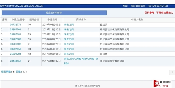 不过令人意外的是,8月7日,有微博网友发现,微博CEO的个人微博账号昵称“来去之间”也被抢注为商标,而且商标用途为情趣用品。