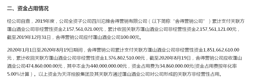 根据公告,2019年以来,天洋控股集团及其关联方通过蓬山酒业公司非经营性占用舍得酒业资金。其中,2019年度累计发生金额约为21.6亿元,2020年至今累计发生金额约为18.5亿元。