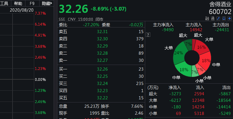受上述消息影响,舍得酒业20日跳空大跌,盘中一度跌停报31.8元,最终收报32.02元,跌8.69%,股价创近两个月新低。