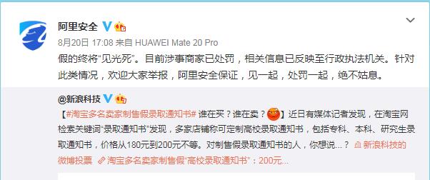 阿里安全官方微博转发文章回应说:假的终将“见光死”。目前涉事商家已处罚,相关信息已反映至行政执法机关。针对此类情况,欢迎大家举报,阿里安全保证,见一起,处罚一起,绝不姑息。