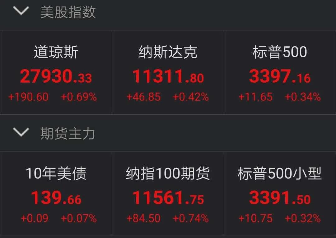 截至今日凌晨收盘,标普500指数收盘上涨11.60点,涨幅0.34%,报3397.16点;纳斯达克指数收盘上涨46.80点,涨幅0.42%,报11311.80点;道琼斯指数收盘上涨190.60点,涨幅0.69%,报27930.33点。道指本周累计涨跌持平,纳指累涨2.65%,标普500指数累涨0.72%。