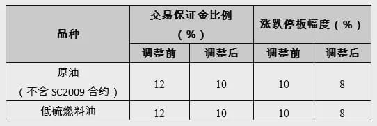 8月21日晚间,上期能源中心发布通知,自2020年8月24日(周一)收盘结算时起,除SC2009合约外,原油期货其他合约的交易保证金比例调整为10%,涨跌停板幅度调整为8%;低硫燃料油期货合约的交易保证金比例调整为10%,涨跌停板幅度调整为8%。