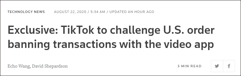 路透社评价称,TikTok此次发起的法律挑战,只针对特朗普在8月6日签署的行政令,与8月14日“要求字节跳动90天内剥离TikTok美国业务”的行政令不相关。因此,这一举动并不能让字节跳动免于被迫剥离TiKTok的命运。不过此举表明,字节跳动正寻求动用法律手段,以防止TikTok交易谈判演变成一场“大甩卖”。
