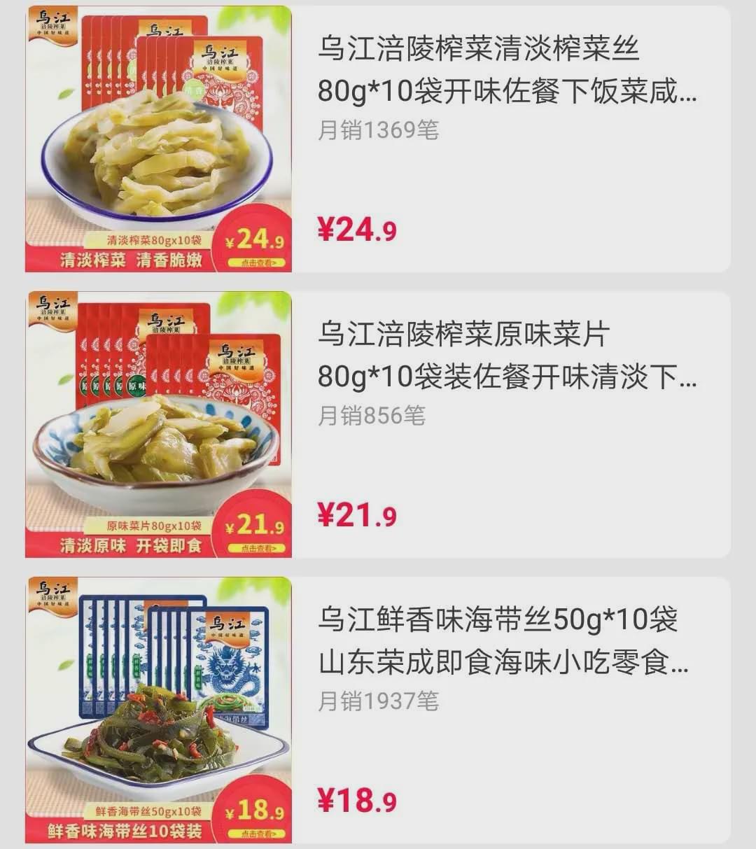 目前,天猫涪陵榨菜旗舰店在售商品中,80g的榨菜10袋售价24.9元,平均一袋不足2.49元。