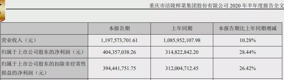 8月20日晚,涪陵榨菜发布半年报显示,公司实现营业收入11.98亿元,同比增长10.28%;实现归属于上市公司股东的净利润4.04亿元,同比增长28.44%。报告期内,公司技改提产能成效显著,实现了产品包装全品项铝箔化,产品升级全面完成。15g系列、30g充氮系列、38g邱氏菜坊系列、150g脆口榨菜(PDQ量贩)、180g泡豇豆、800g团餐产品、乌江榨菜酱油等战略新品先后投产入市。