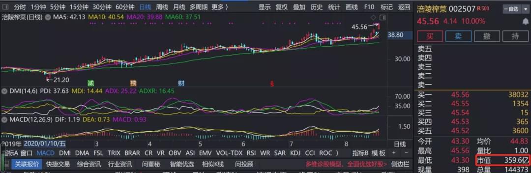 涪陵榨菜开盘7分钟后迅速涨停,截至收盘,报45.56元/股。今年股价累计涨幅达72.38%,公司市值达到359.63亿元,一举超过白云机场317.84亿元市值。