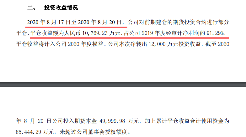 8月21日晚,秦安股份法律与公告,8月17日至8月20日,公司对前期建仓的期货投资合约进行部分平仓,平仓收益额为1.08亿元,占公司2019年度经审计净利润的91.29%,平仓收益将计入公司2020年度损益。