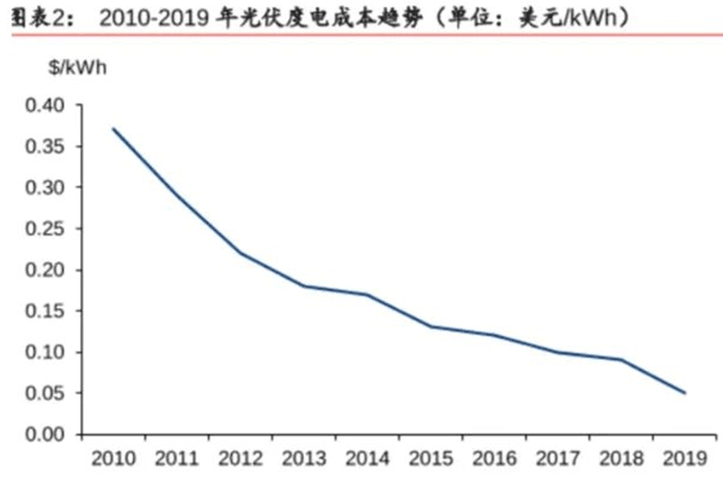 光伏发电规模快速增长,得益于成本不断下降和实现平价上网,即光伏发电成本可与常规火电持平。国家电网预计,2020年光伏度电成本0.24元-0.5元,部分地方成本已低于火电成本。