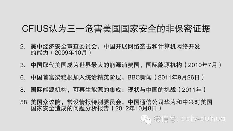 比如在后来三一参加央视访谈节目时公开了非保密证据,三一重工总裁向文波表示,其中很“扯”的理由,比如网络袭击和计算机网络跟我们这个风力发电有什么关系,这个直到现在为止也没想清楚。第二个,中国取代美国成为世界最大的能源消费国,这个跟这个风电危害国家安全有什么关系,我也没想明白。
