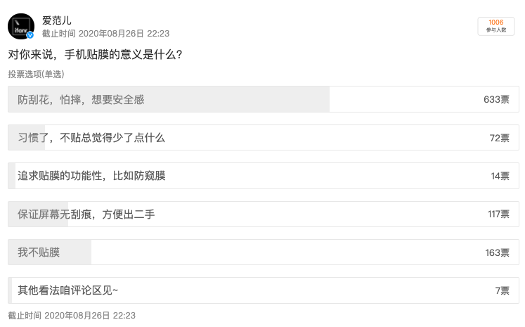 还有一小部分人是受习惯影响,「从买第一台智能手机,我就开始贴膜,已经成为一种习惯了,你要是不让我贴,我就感觉手机是不完整的」。有人表示。