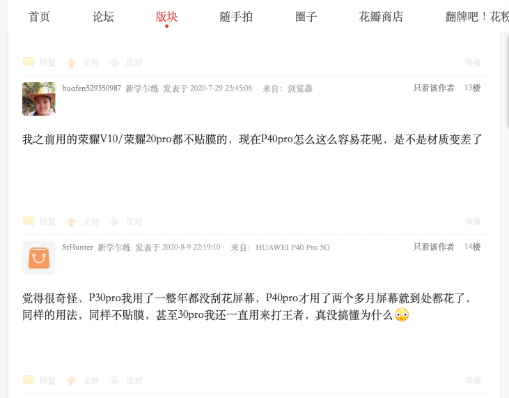 ▲ 华为论坛中,有用户反映 P40 Pro 的屏幕不耐磨