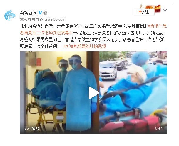 一名新冠肺炎康复者自欧洲返回香港后,其新冠病毒检测结果再次呈阳性。香港大学微生物学系团队证实,该患者是第二次感染新冠病毒,属全球首例。