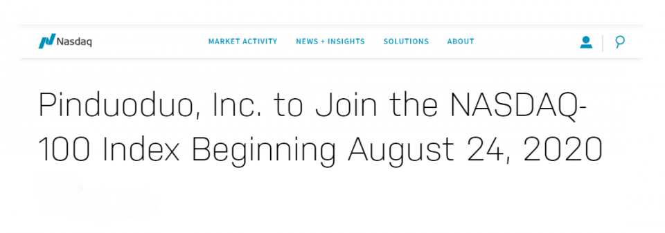 北京时间8月25日,纳斯达克交易所正式将拼多多纳入“纳斯达克100指数”成分股,后者成为目前最年轻的成分股企业,同时也是纳斯达克历史上,从创立到入榜时间用时最短的企业。