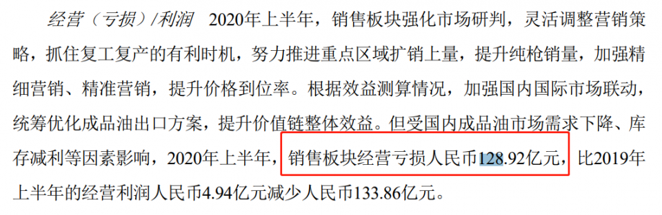 在全部业务板块中,炼油和销售业务板块贡献了绝大部分的亏损,分别出现亏损105.40亿元和128.92亿元。