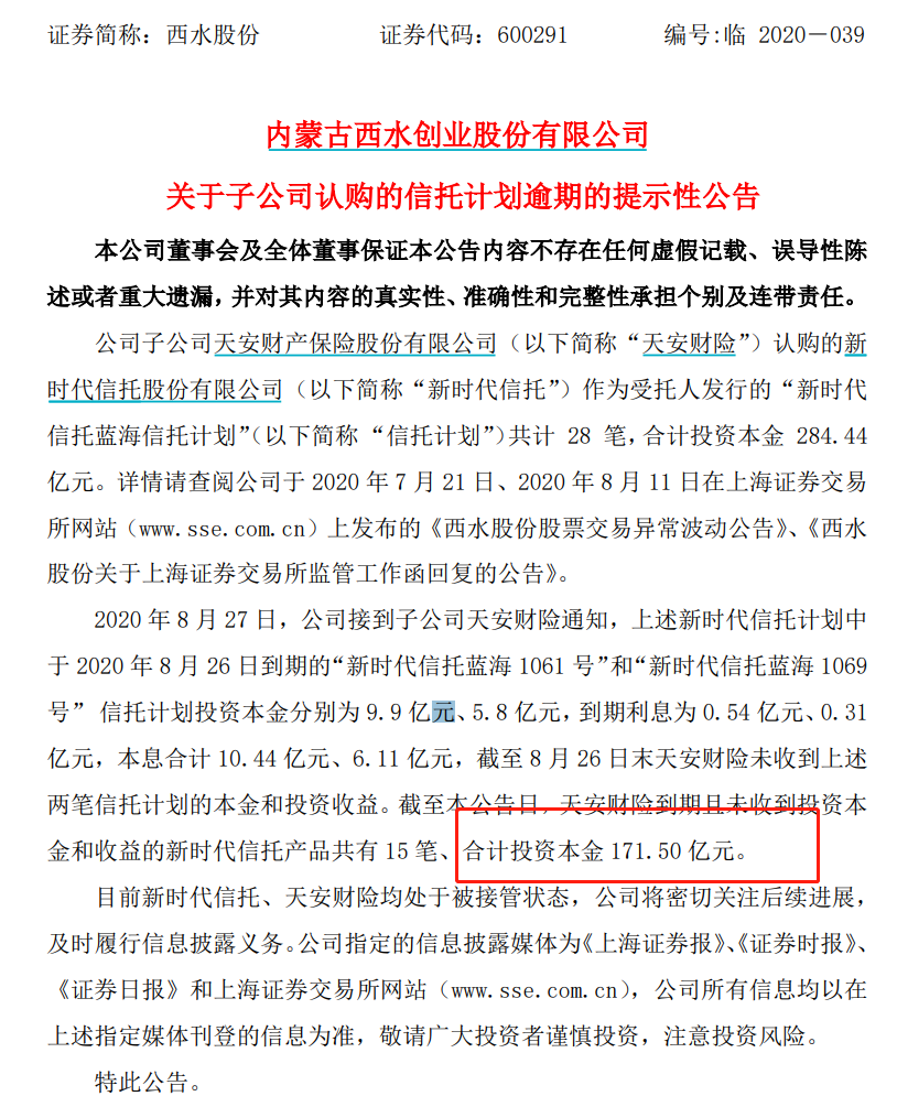 近日,公司接到通知,子公司天安财险认购的新时代信托作为受托人发行的“新时代信托蓝海信托计划”(以下简称 “信托计划”),其中于 2020 年 6 月份到期的信托产品共有 5 笔、合计投资本金 60.40 亿元,逾期之后,天安财险积极努力与各方进行了协商,但是截止目前该投资资金逾期未收回,存在到期不能兑付风险。