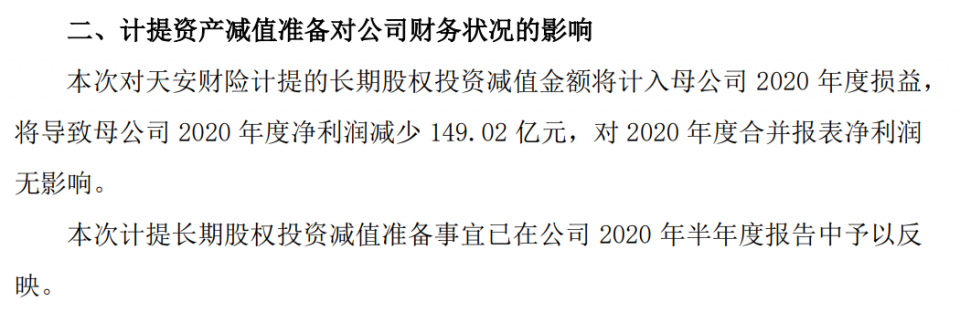 另外,因子公司天安财险持有的信托产品等资产到期后发生实质性违约,为真实反映截至 2020 年 6 月 30 日的财务状况和经营情况,天安财险对截至 2020 年 6 月 30 日的相关投资资产进行了减值测试。