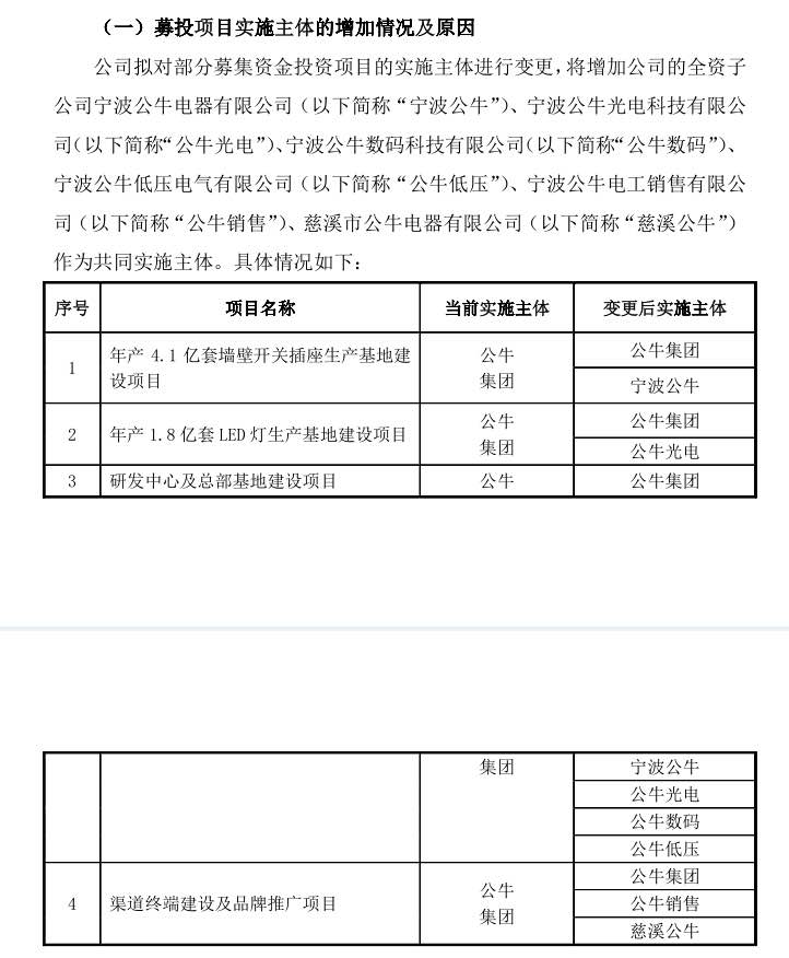对此,公牛集团的解释为,宁波公牛为负责墙壁开关插座研发和生产的全资子公司,所以增加宁波公牛为年产 4.1 亿套墙壁开关插座生产基地建设项目的实施主体;公牛光电为负责LED灯研发和生产的全资子公司,所以增加公牛光电为年产1.8亿套LED灯生产基地建设项目的实施主体;宁波公牛、公牛光电、公牛数码、公牛低压分别为研发、生产墙壁开关插座、LED灯、数码精品、断路器等产品的法人主体,所以增加该四家公司为研发中心及总部基地建设项目的实施主体;公牛销售、慈溪公牛为主要负责产品营销的法人主体,所以增加该两家公司为渠道终端建设及品牌推广项目的实施主体。通过增加上述实施主体,可有效整合公司内部资源,降低经营成本,提高运营及管理效率,使募投项目在建设实施过程中及投产后能够更好的运营。
