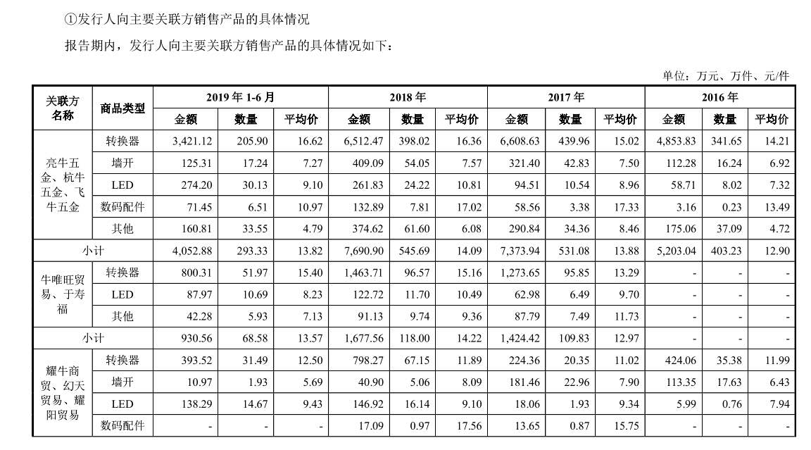 其中,引人瞩目的是,虽然交易金额不算特别高,但公牛集团销售给三金的产品单价却另有玄机。招股书显示,2016-2018年及2019年上半年,公牛集团销售给三金的转换器价格分别为14.21元/件、15.02元/件、16.36元/件、16.62元/件,与当时的其他关联方相比,除了宸皓电子组,单价要高出至少1元/件,尤其与耀牛贸易组、坚科贸易组、利波电器组相比,每期单价至少高出3元/件。