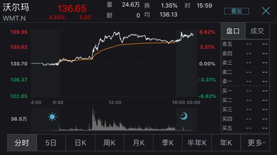 消息出炉后沃尔玛盘中直线拉升,截至收盘大涨4.55%。