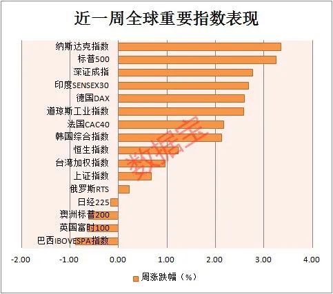 从一周表现看,全球重要指数涨多跌少,纳斯达克指数、标普500和深证成指涨幅居前,本周分别涨3.35%、3.26%、2.77%,巴西IBOVESPA指数和英国富时100指数分别下跌0.88%、0.64%,跌幅居前。