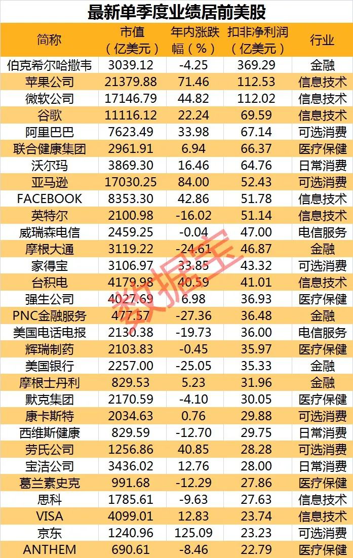 业绩紧随其后的是苹果公司、微软公司和谷歌,均属信息技术行业,也是美股市值排名居前的公司,近期股价屡次刷新历史纪录高点。