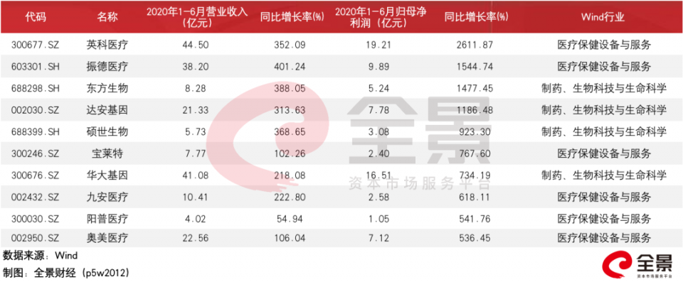 2020年上半年,疫情促使口罩、医用手套、呼吸机等医疗物资的需求急剧增加,带来了相关企业业绩的暴增。Wind数据显示,截至8月28日,有39家医药公司归母净利润同比增速超过100%。