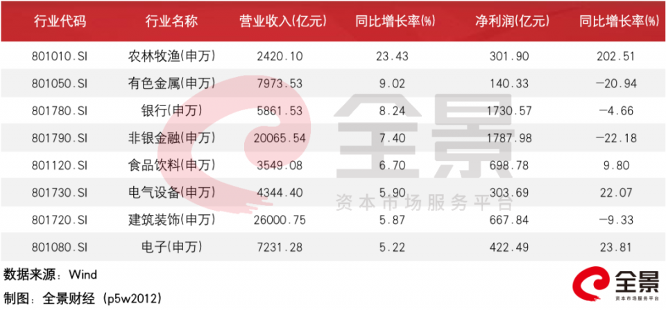 疫情冲击下,上半年行业分化明显。wind数据显示,从营收端观察,上半年农林牧渔、有色金属、银行、非银金融、食品饮料、电气设备、电子和建筑材料营收增幅均在5%以上。其中受惠涨价影响的农林牧渔上半年营收增幅高达23.42%,为申万一级各行业之首。