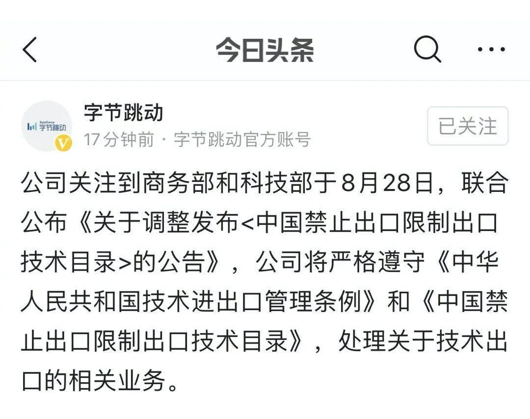 北京字节跳动科技有限公司8月30日晚表示,公司关注到商务部和科技部于8月28日,联合公布《关于调整发布<中国禁止出口限制出口技术目录>的公告》,公司将严格遵守《中华人民共和国技术进出口管理条例》和《中国禁止出口限制出口技术目录》,处理关于技术出口的相关业务。