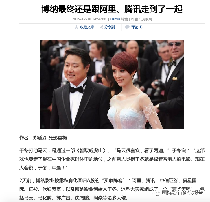 2010年,博纳影业在纳斯达克上市,那时候巩俐是敲钟嘉宾,但中概低迷,于是于东在阿里等的帮助下在2016年从美国退市准备回归A股。