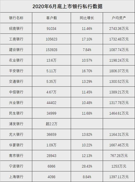 除了招行的私行客户户均2743万元;浦发银行披露私行客户资产近4500亿元,客户数超2.2万户,户均资产也有约2000万元;平安银行、工商银行、华夏银行私行的户均资产也较高,分别为1806万元、1732万元和1667万元;民生银行私行户均资产为1465万元。