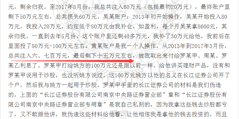 据胡吉兵称:其和姚方私下聊天,说现在股票行情很好,如果投资可以赚很多钱。当时跟他说自己没有很多钱,还吹牛说我操作股票的技术还不错。然而事与愿违,“2012年至2014年我年收入8万元-10万元左右。骗取罗某甲第一笔钱款时,我和姚方考虑过股票市场会存在亏损,我们认为到时就算亏,亏到90万元我们就不操作了,大不了我们一人亏5万元。但后来骗到的钱越来越多时,我们就没考虑到这个问题了。还有当时行情很好,也被冲昏了头脑,觉得肯定没有问题。2015年我有一套价值70万元的房子可以用来还钱,2017年卖掉抵吴某的债了。”他表示。