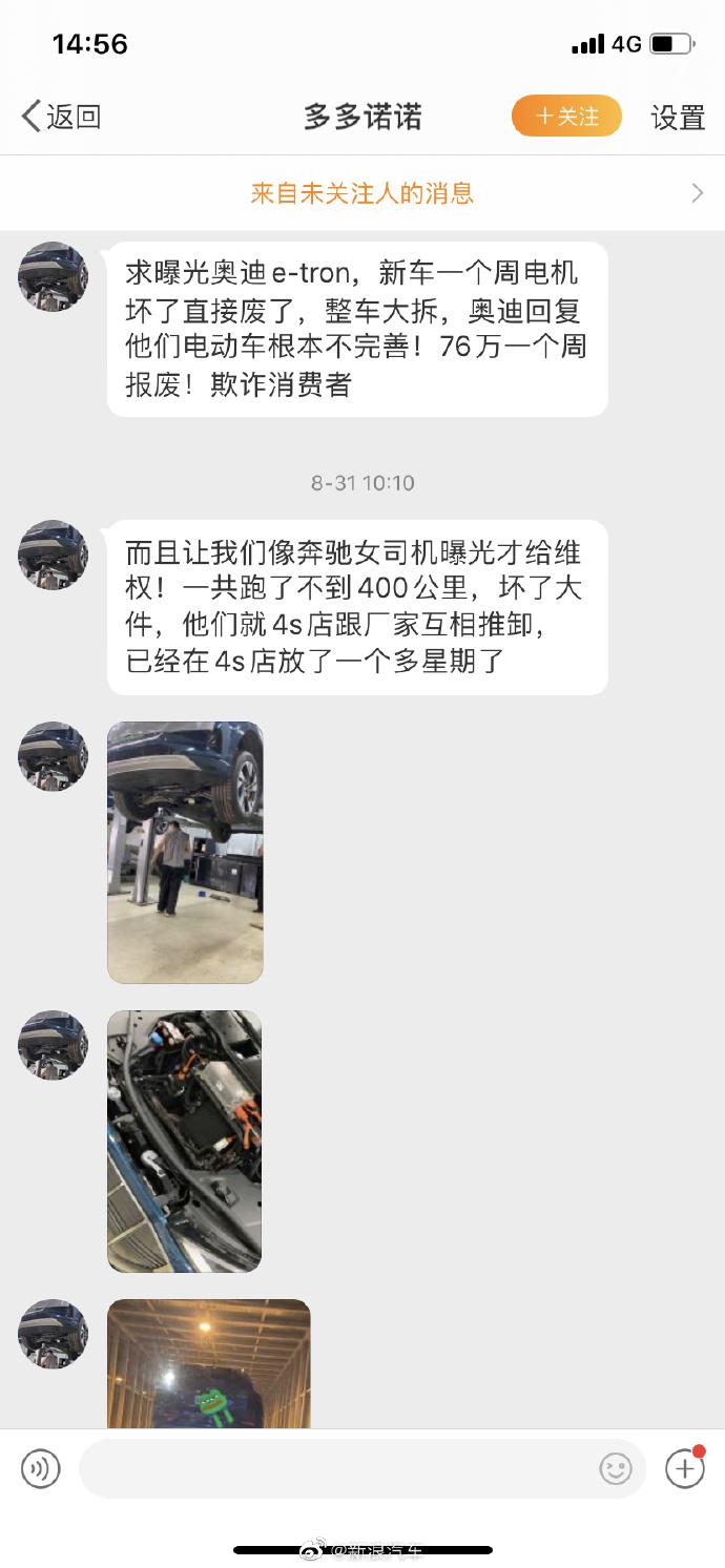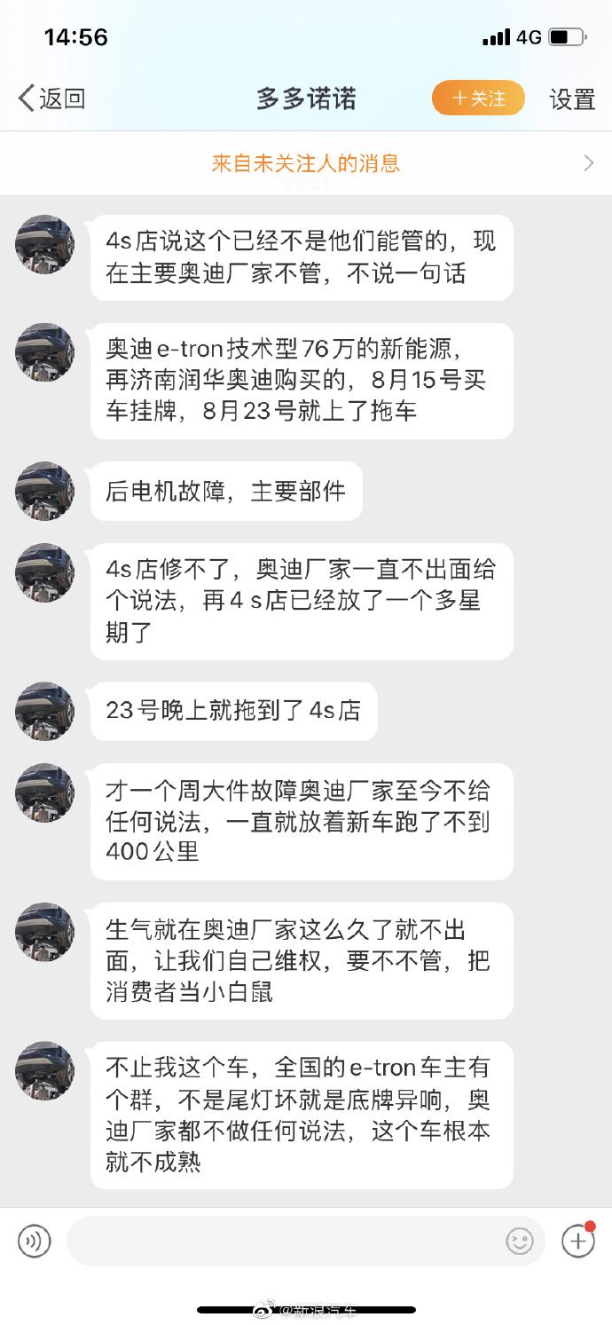 商业 奥迪新车不到400公里电机报废 厂家至今未出面 2020-09-02 15:41:41 分享 新浪汽车微博报道【奥迪e-tron购买一周电机报废 车主如果能像奔驰女司机那样曝光才给维权】网友@多多诺诺 私信我们:奥迪e-tron购买一周,行驶不到400公里,出现电机报废情况,需整车大拆。在沟通过程中让车主像奔驰女司机曝光才给维权!4s店与奥迪厂家互相推卸,现在故障车已经在4s店放了一个多星期。据悉,该网友的奥迪e-tron技术型购入花费76万,购于济南润华奥迪4S店,8月15号买车挂牌,8月23号上了拖车。具体见截图: