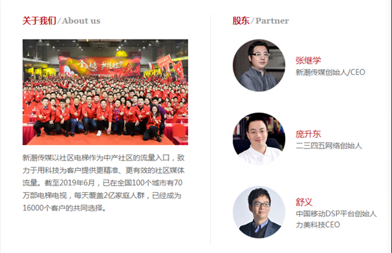 据新潮传媒官网显示,该传媒以社区电梯作为中产社区的流量入口,致力于用科技为客户提供更精准、更有效的社区媒体流量。截至2019年6月,已在全国100个城市有70万部电梯电视,每天覆盖2亿家庭人群,已经成为16000个客户的共同选择。